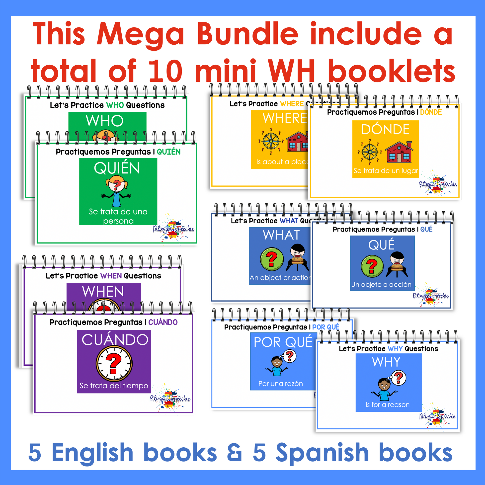 This is a MEGA bundle deal that includes 10 bilingual & interactive booklets that focus on WH- questions. There are 5 English booklets for who, what, when, where & why and 5 Spanish booklets for quién, qué, cuándo, dónde, y por qué making it a grand total of 140 questions!
