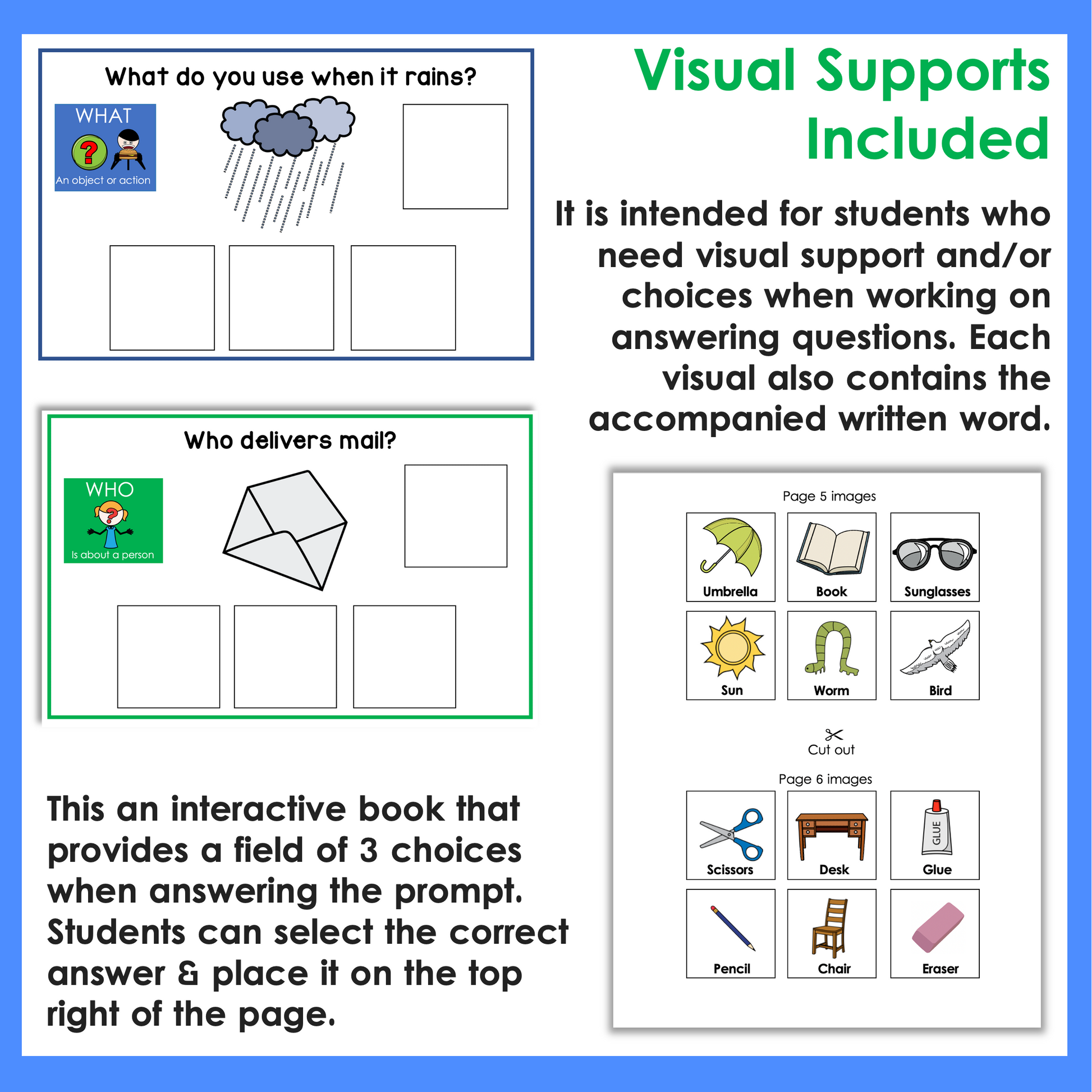 Each booklet provides a field of 3 choices when answering the prompt. It is intended for students who need visual support and/or choices when working on answering questions. Each visual also contains the accompanied written word.