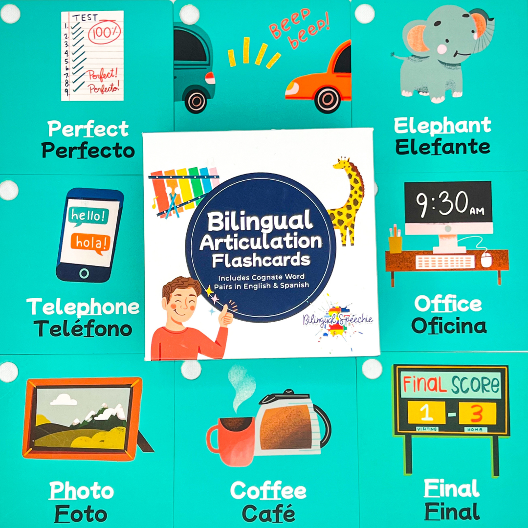 These unique bilingual flashcards utilize cognate words as the main targets on each card & also supports evidence-based research on the use of cognate words with bilingual speakers. Cognate words are defined as having the same linguistic derivation as another.