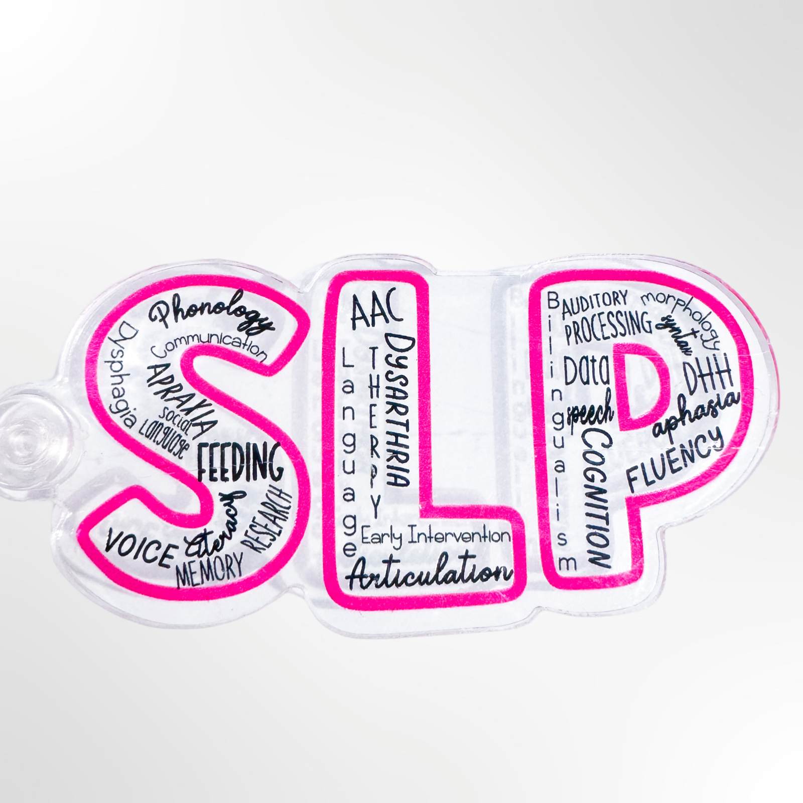 This is a handmade clear acrylic keychain that comes with a large pink wristlet. Lettering reads "SLP" and includes several domains of practice within the lettering.